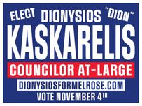 Hello! My name is Dionysios Kaskarelis, but most people know me as "Dion". It's an honor to step forward as a candidate for Councilor-at-large in Melrose. I am a husband, father, homeowner, and proud Greek-American. I’m also an immigrant who became a U.S. citizen on July 31, 2025 (no, this is not a typo). While pulling papers only two weeks later is probably a record, for me it's a natural step to give back to the community that supported me. My wife, Gloria, and I moved from Jamaica Plain to Melrose in May 2023 together with our son Leo, now twenty months old, and our senior dog, Gustavo.